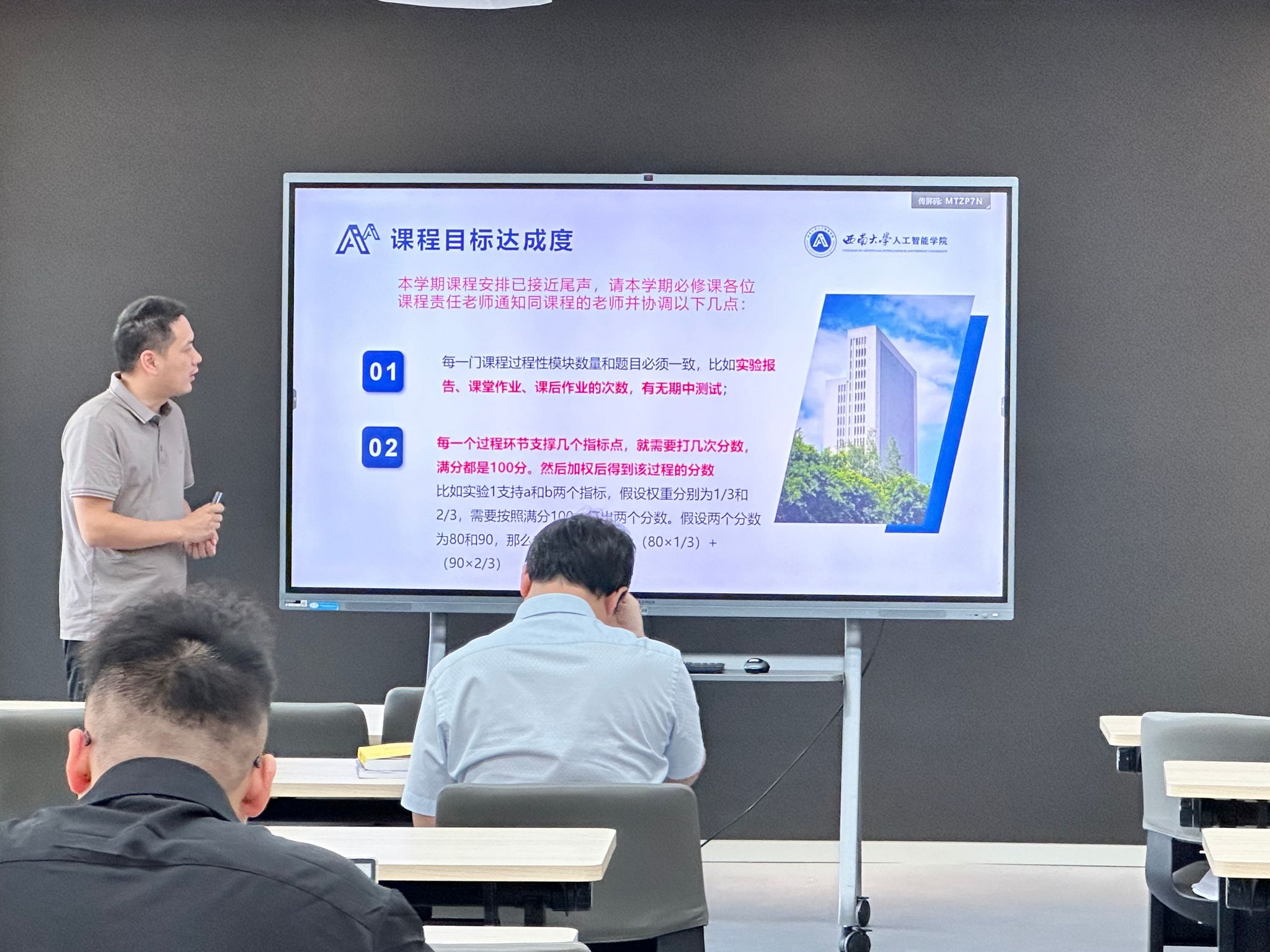 张里博老师向全体教职工分享有关课程达成度分析报告的实践与理解,并以具体课程为例详细介绍了如何根据工程认证要求撰写教学大纲并开展课程目标达成度分析以及该项工作需要注意的细节。