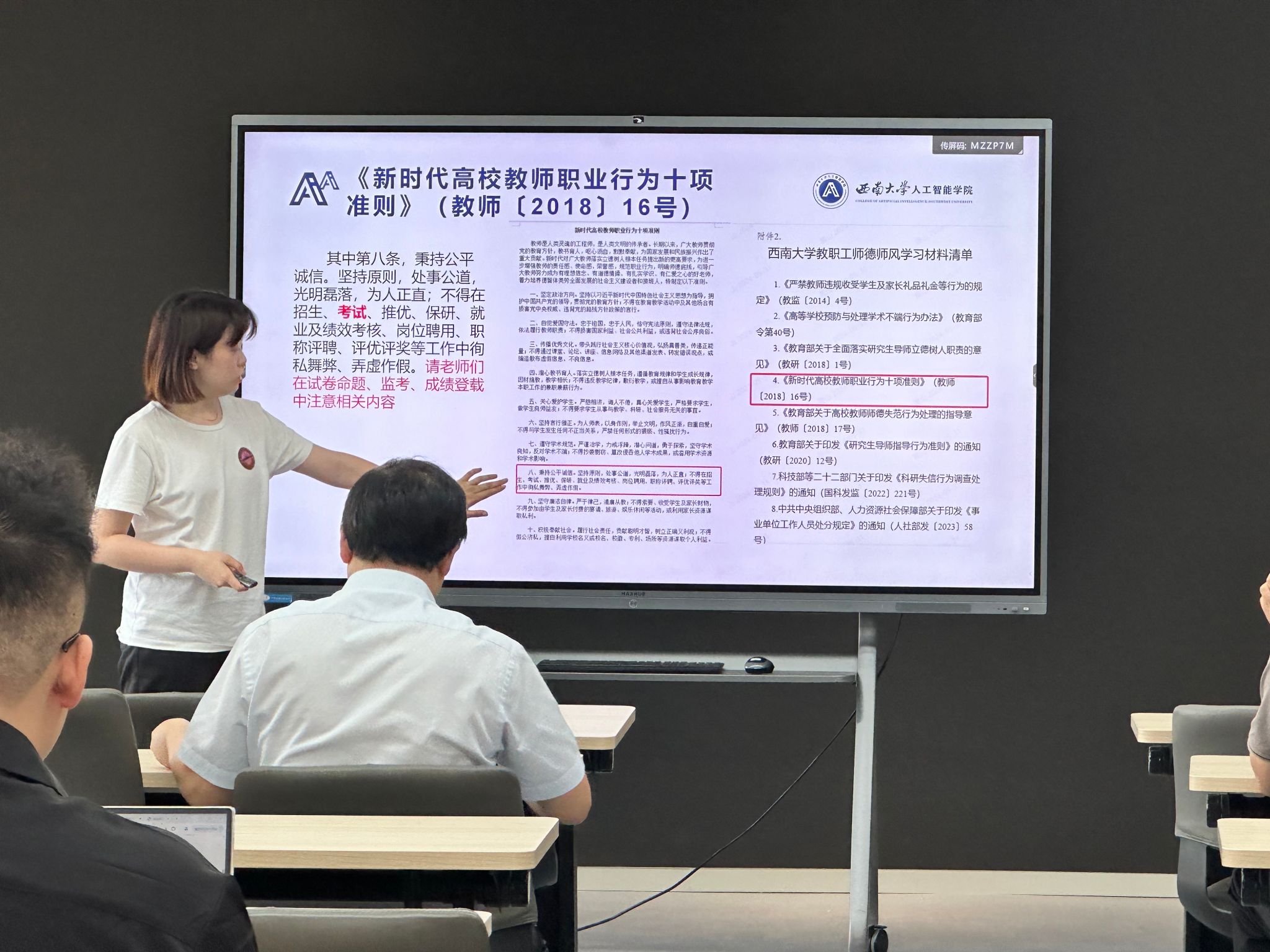 随后,教学办黄山主任针对通知要求,就《新时代高校教师职业行为十项准则》(教师〔2018〕16号)、《点点taptap官方网站全日制本科课程考核管理办法》《点点taptap官方网站本科课程成绩评定与管理办法(修订)》《监考须知》等文件中有关试卷命题、考试监考等内容组织全体参会老师进行学习并作详细解读说明。