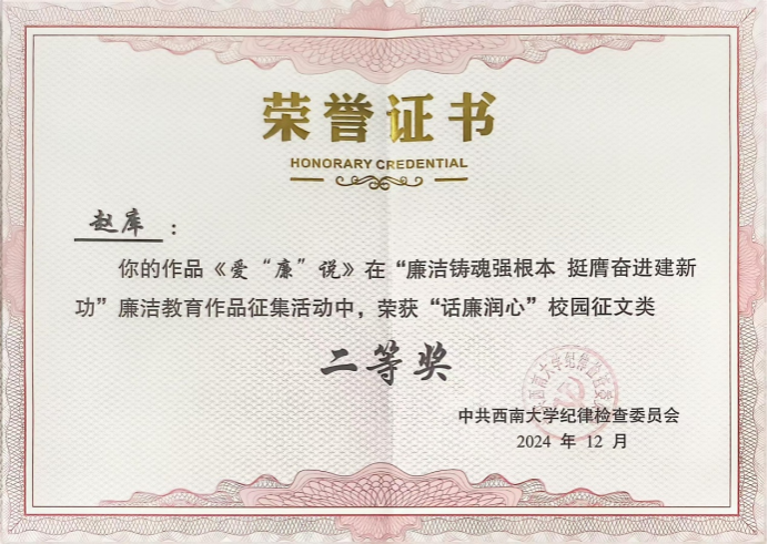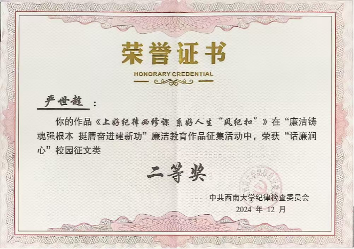 近日,在学校纪委开展的“廉洁铸魂强根本,挺膺奋进建新功”廉洁教育作品征集活动中,由学院纪委组织推荐的两项作品获得表彰,学院专职组织员严世趁老师创作的《上好纪律必修课 系好人生“风纪扣”》、2021级本科生赵库同学创作的《爱“廉”说》分别荣获学校“话廉润心”校园征文二等奖。
