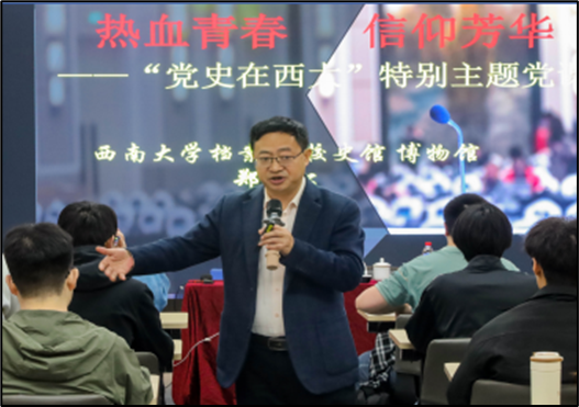 郑劲松老师以《热血青春 信仰芳华——“党史在西大”》为题开展专题教学,从江姐与西大学子的渊源讲起,围绕初心、使命、反思、梦想四个维度,将党史学习教育与校史传承深度融合。通过袁隆平、胡锦矗等杰出员工的治学事迹,展现学校深厚文化底蕴;结合黎洁霜、萧明华等革命先烈的英勇故事,引导学员领悟红色精神内核。他勉励学员深耕专业领域,积极参与校史馆数字化建设,以青春力量传承红色基因,书写新时代青年华章。