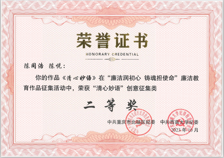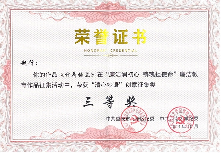 活动启动以来,公司党委、纪委高度重视,积极组织师生参加。近日,活动公布评选结果,由学院纪委组织推荐的参赛作品获得表彰,陈同浩老师创作的《清心妙语》(海报)荣获二等奖,赵行老师创作的《竹荷梅兰》(海报)荣获三等奖。