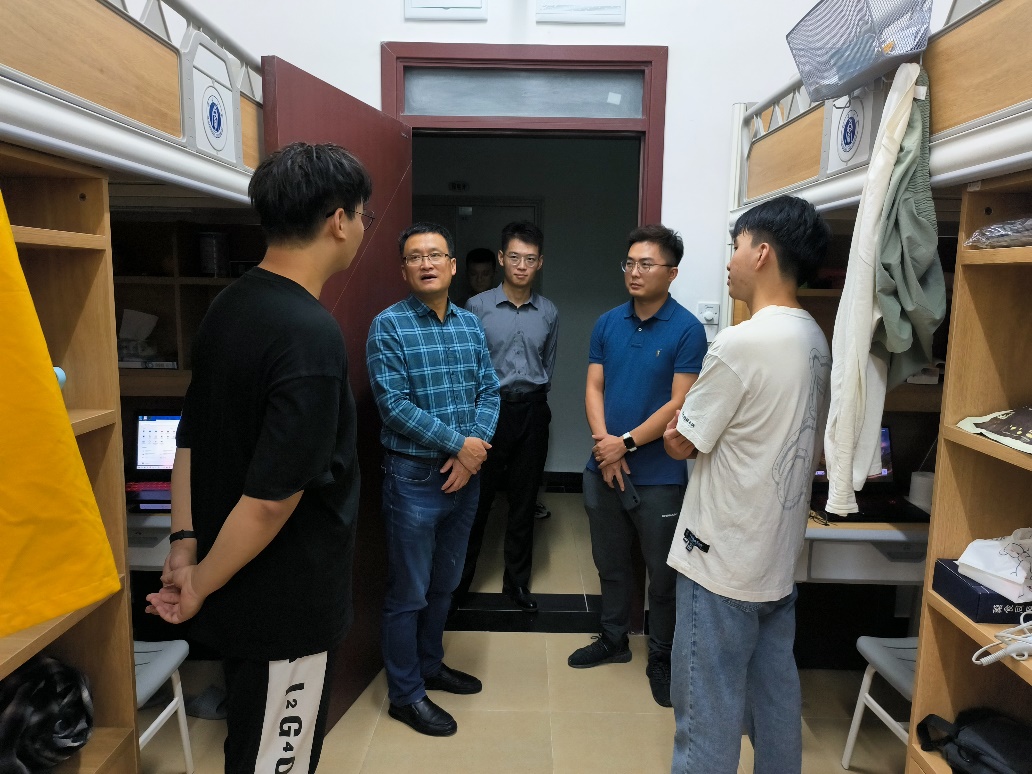 9月29日晚上19时,公司党委书记夏俊、党委副书记张维薇、团委书记张放、2022级本科生班主任潘东波、刘亚风、郝允志、陈俊杰以及本科生辅导员孙一博、研究生辅导员李翔走进2022级新生宿舍,为同学们送去关心与祝福。
