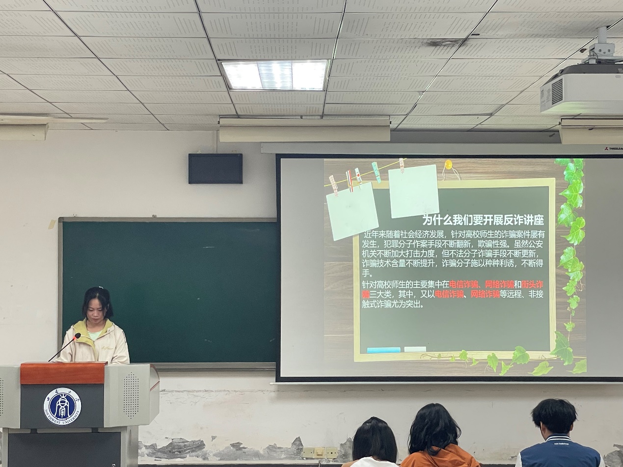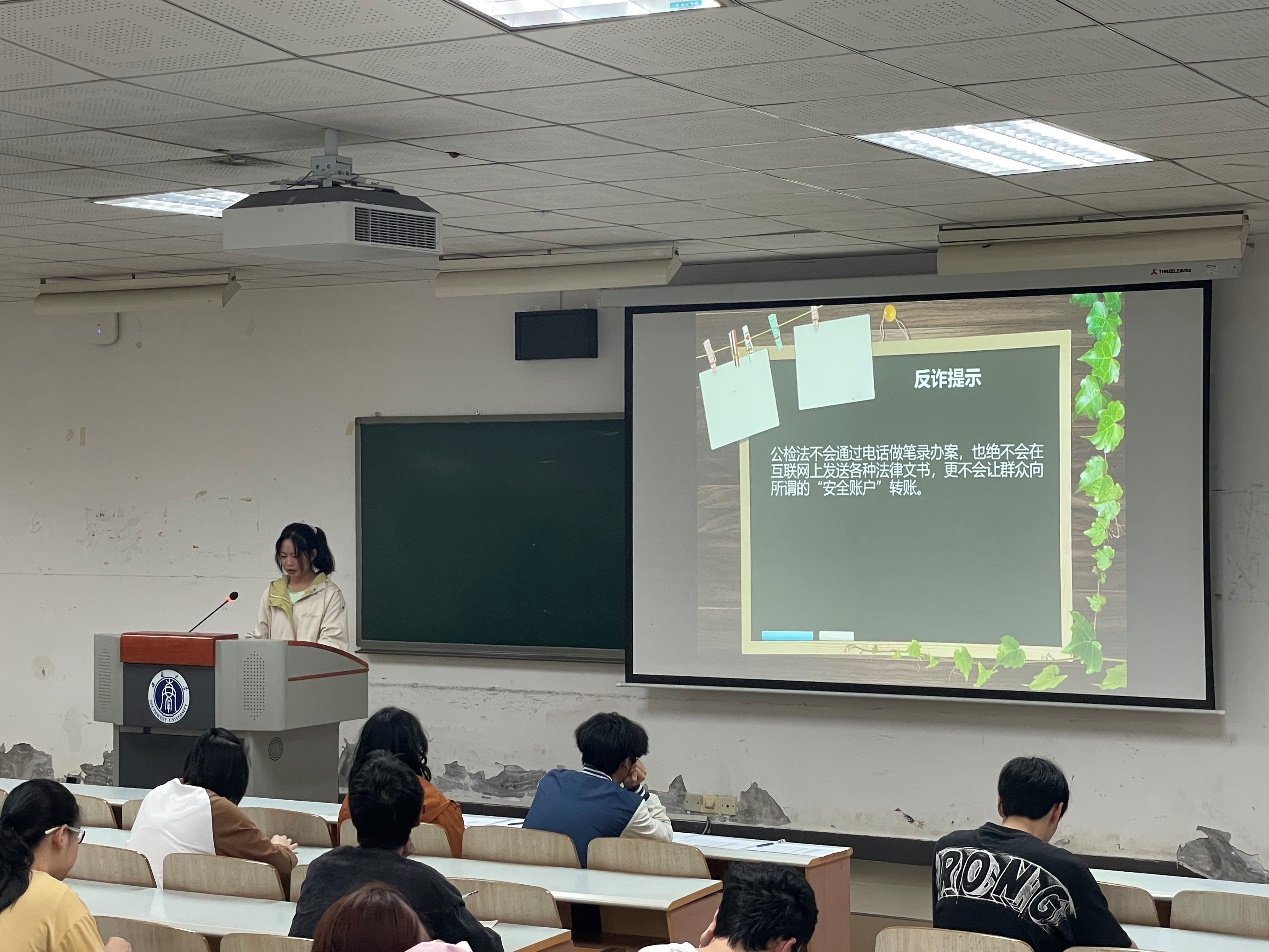 本次宣讲活动主讲人是院员工会生活权益部干事李雪蓉。她主要从开展反诈讲座的意义、诈骗类型、经典案例以及如何预防诈骗四个方面为同学们进行讲解。