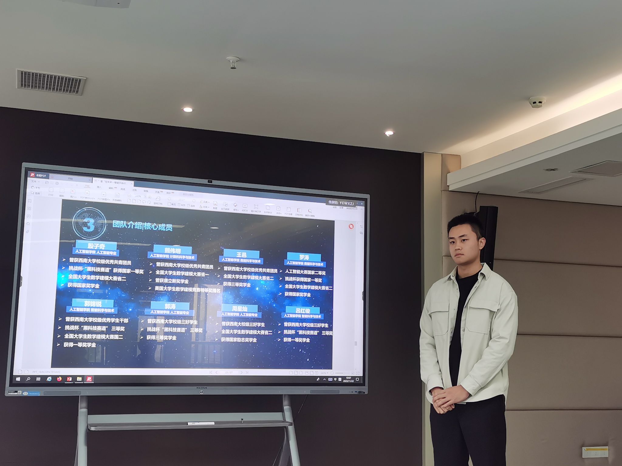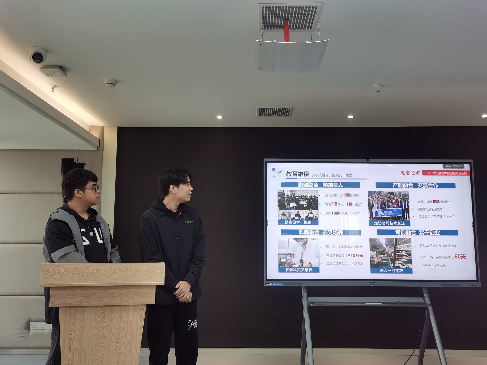 答辩由员工介绍和评委提问两个部分组成,在员工介绍阶段,参赛选手利用PPT展示团队项目,从项目简介、项目意义、成员介绍、产品内容、实践过程、行业前景、营销策略、融资说明等各个方面进行详细阐述,生动活泼展示产品价值。