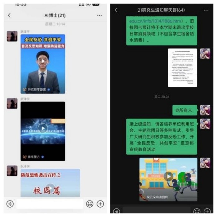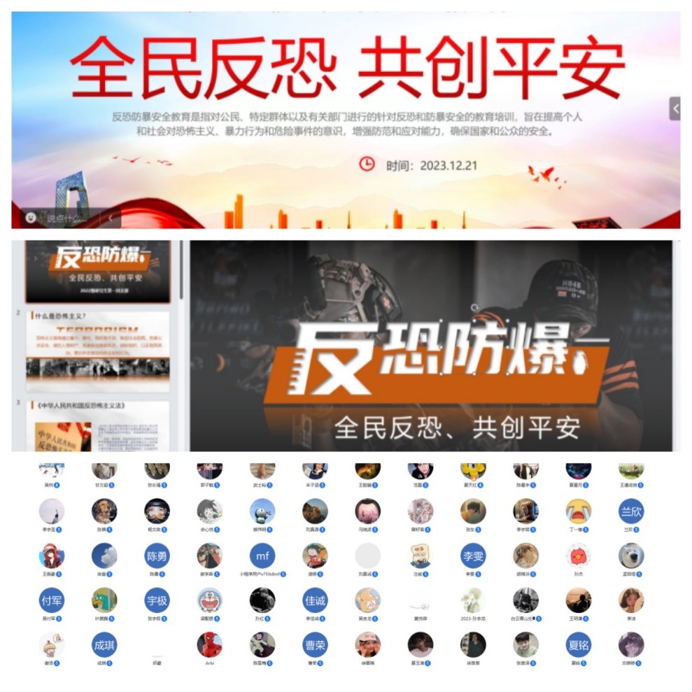 活动以年级为单位自行组织开展。博士研究生与2021级硕士研究生通过在微信群内转发“全民反恐,共创平安,普及反恐知识,增强防范能力”“《中华人民共和国反恐怖主义法》宣传片”“《防范恐怖袭击宣传之校园篇》”等视频进行自主学习。