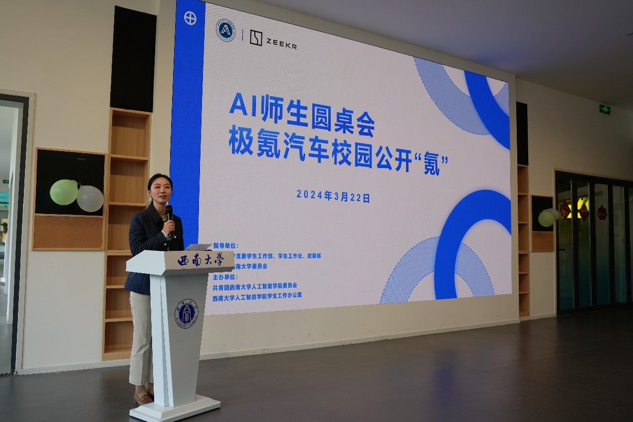 活动伊始,公司党委副书记、纪委书记张维薇向极氪汽车团队的到来表示热烈欢迎,向同学们介绍了极氪汽车科技基本情况,希望同学们通过本次活动,认识到人工智能技术对发展新质生产力的重要性,从而更好地投入专业学习并预祝本次公开“氪”取得圆满成功。