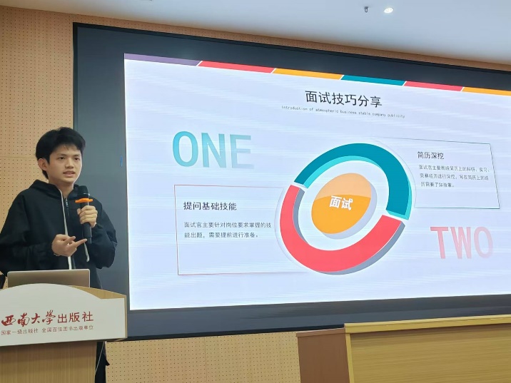 2021级数据科学与大数据专业本科生朱天池(目前已获腾讯数据科学岗offer),以《就业早规划》为主题,提出了就业方向选择的重要性,要紧密结合学院培养方案,选择契合的岗位。同时提到企业十分看重实习经历,建议大家可以从小企业着手,一步步进阶到大厂实习,不断积累,为今后的求职打下坚实的基础。