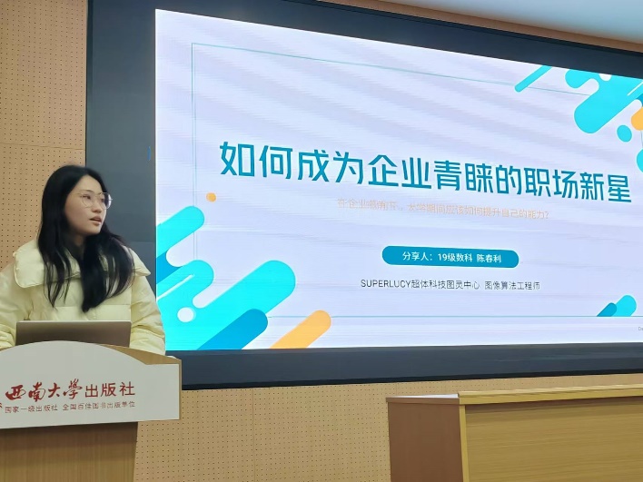 2019级数据科学与大数据技专业优秀毕业生陈春利(现就职于SUPERLUCY超体科技图灵中心,担任图像算法工程师一职)以《如何成为企业青睐的职场新星》为主题,围绕学习方法、岗位目标、求职技巧三个方面分享了自己的经历,为同学们成为职场新星提出了宝贵的意见和建议。她说道,学习方法方面要注重基础学习、系统化学习和解决问题的能力,并结合自己的兴趣点来将已学知识运用到实际问题里。同时还需要明确岗位目标,提前掌握岗位技能,为今后的求职做好充足的准备。