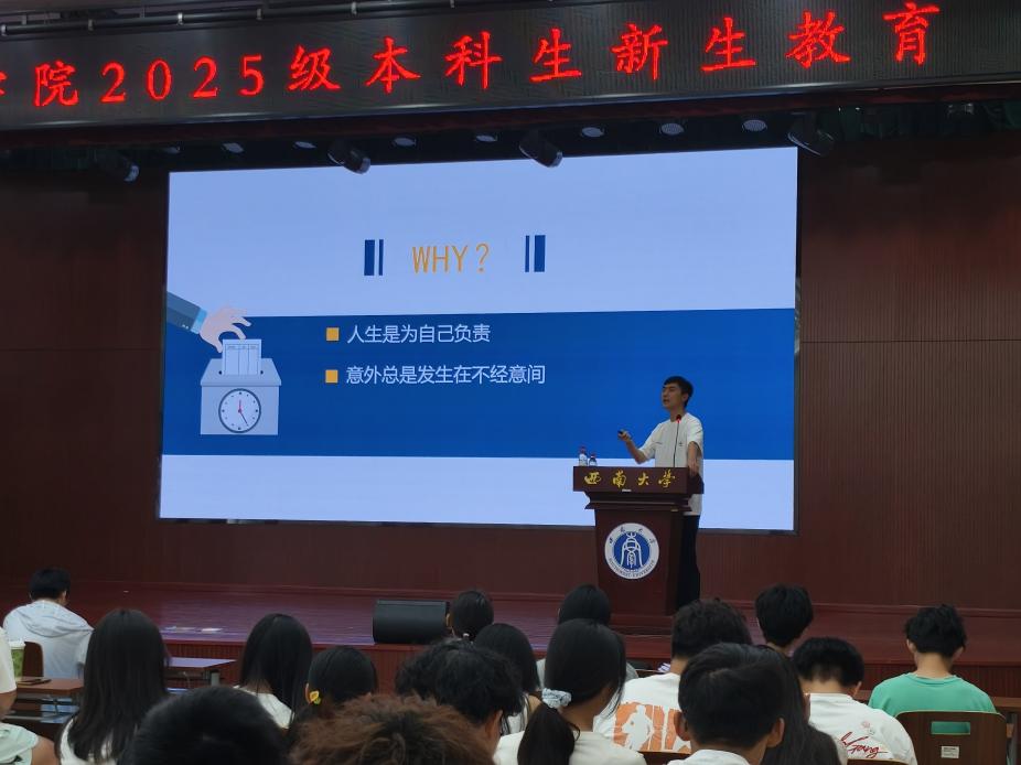 随后,学院孙一博老师针对安全教育作专题讲座。他围绕员工日常生活的“衣、食、住、行”四个方面展开讲解。饮食方面,他建议员工优先选择校内食堂,审慎辨别外卖食品;住宿方面,强调安全用电,防范火灾风险;出行方面,提醒员工遵守交通规则,行走时不佩戴耳机、不沉迷手机,确保自身安全。此外,他还针对外出活动提醒员工保持警惕,谨防不明旅行团和各类诈骗陷阱。针对实验室安全,他强调必须严格遵守规章制度,做到规范操作设备。在集体活动中,应避免盲目聚集,远离人流密集区域。谈及恋爱关系时,他建议员工理性看待感情,建立健康积极的交往模式,并树立共同发展的长远目标。最后,孙一博老师寄语新生提高安全意识,平稳度过老员工活,广泛结交益友,收获充实而有意义的大学时光。
