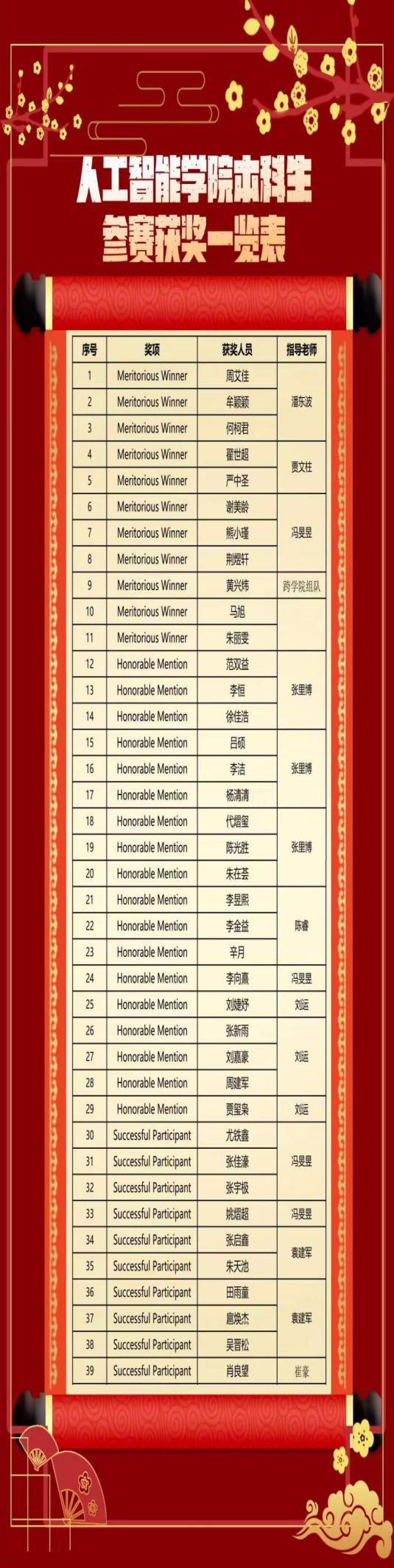 在2023年的美国老员工竞赛中,公司参赛学子喜获佳绩,共有35支队伍获奖,其中有5支队伍荣获M奖,8支队伍荣获H奖,22支队伍荣获S奖。下面公布参赛队伍的获奖名单: