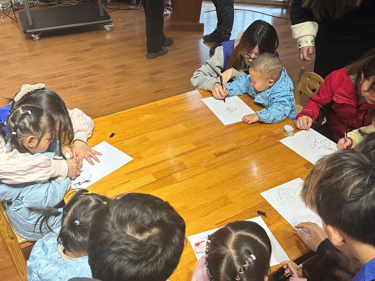 孩子们聚精会神地观看视频,还不时争相回答志愿者们提出的问题,表现出极高的热情,每一位小朋友都得到了一份准备的精美小礼物。随后,志愿者们分发纸笔,带领小朋友们共同完成一幅“小狗”主题的简笔画。在志愿者们耐心指导和小朋友们的积极参与下,一幅幅栩栩如生的小狗画作呈现在白纸上,活动现场充满欢声笑语。