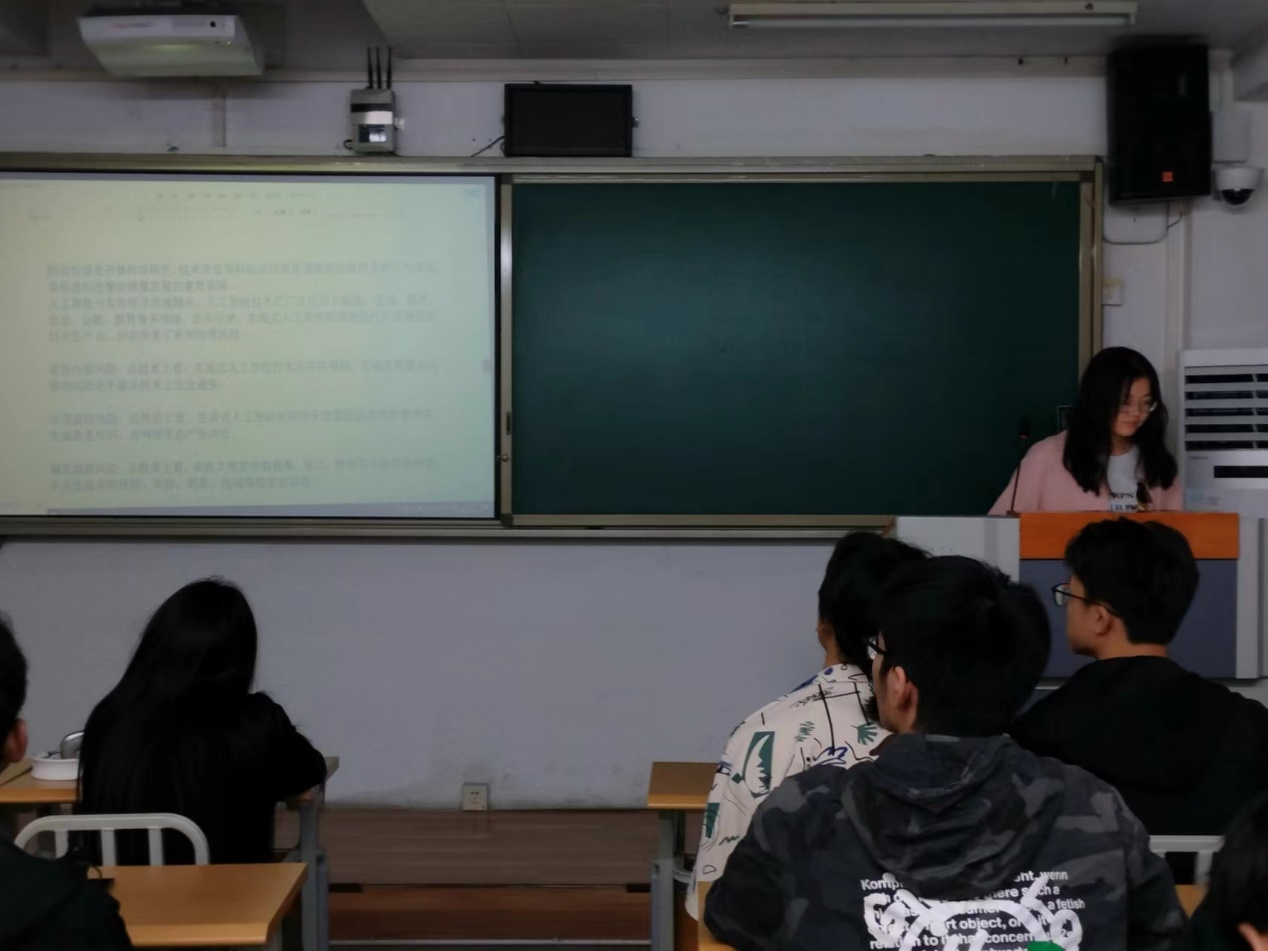 2024级人工智能2班李兰诗玥以“AI复活”这一新颖角度向大家分享了有关科技伦理可能存在的问题,她指出AI“复活”数字人虽然能给人们带来慰藉,但是存在一系列的伦理问题。在人工智能技术飞速发展的时代,不仅要考虑其应用功能,更要注重科技伦理。也从侧面警醒了同学们要理性看待人工智能技术的应用,正确辨别其存在的合理性。