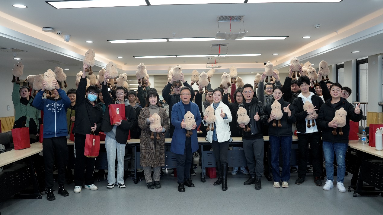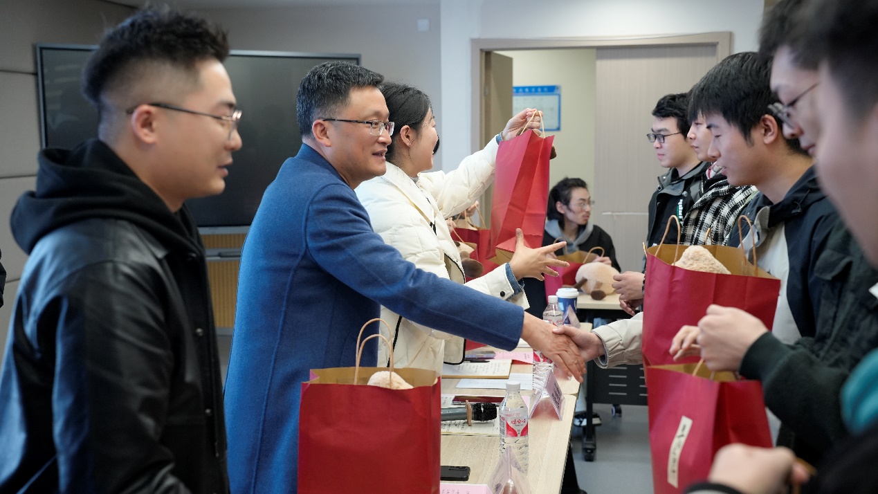 交流结束后,学院领导、老师向考研员工赠送“考研加油包”。花生玩偶——寓意“好事发生”,旺仔牛奶——寓意万事兴旺,文具套装——为学子们提供便利与支持,饱含了学院的深切关爱与殷切期望。同学们高举玩偶,共同留下了珍贵的合影。