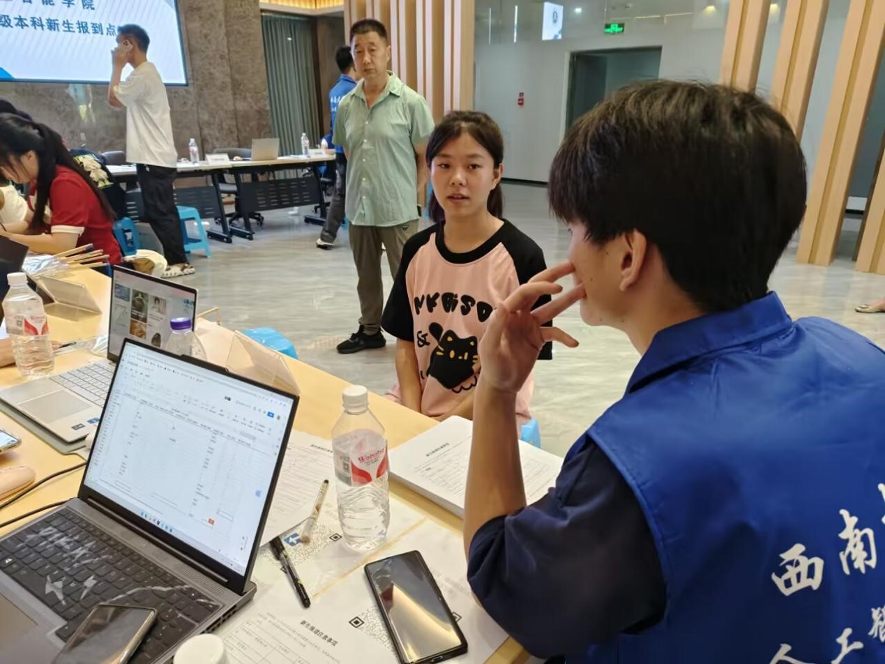 在迎新现场,同学们用热情的笑容欢迎新生的到来。他们为新生讲解校园卡的使用,登录钉钉账号,办理医保、校园宽带,拍摄动漫感照片纪念照片,解答各种疑问,并送上由学院准备的精美礼袋。
