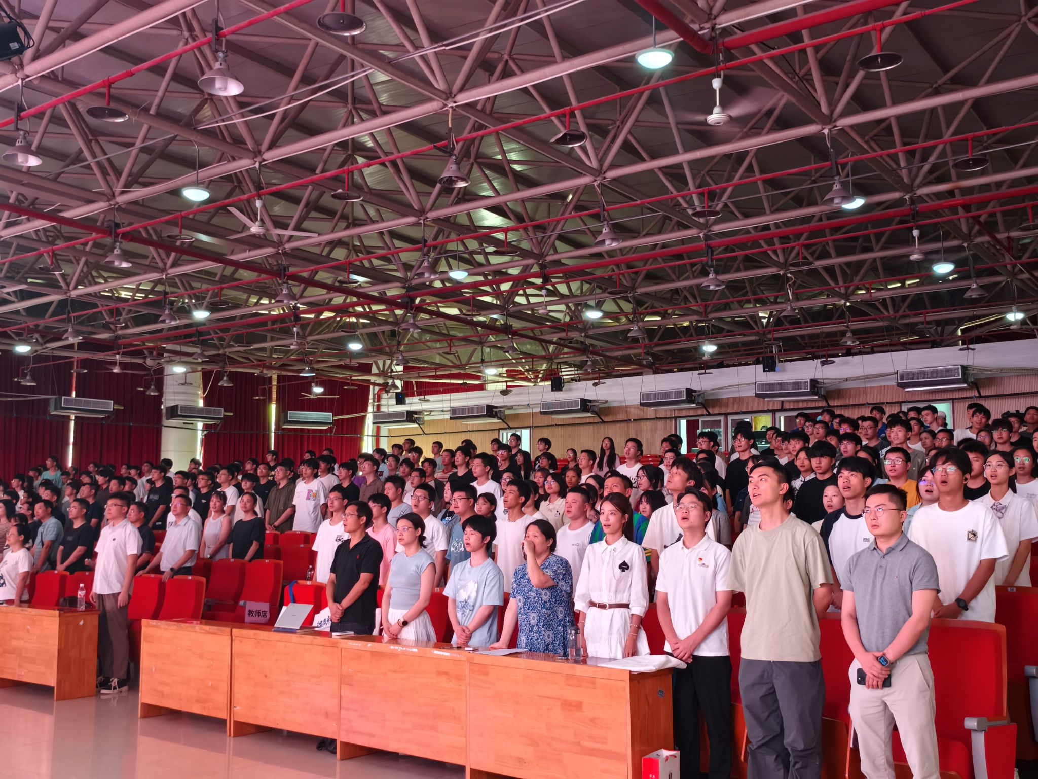 会议伊始,全体参会人员起立,奏唱中华人民共和国国歌。国歌响起,整个会场庄严肃穆,2024级新生见面会正式开始。