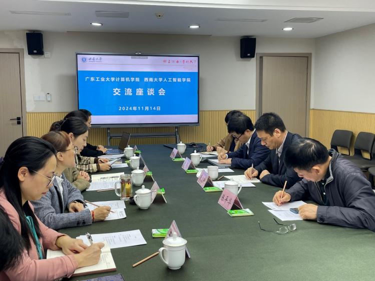 2024年11月14日,广东工业大学计算机公司党委书记杨文新、副经理朱鉴、计算机科学与技术系党支部书记陈平华、网络工程系主任林穗一行来院调研交流。公司党委副书记、纪委书记张维薇,副经理胡小方、陈枫,教工党支部书记张晓燕,智能科学系主任张里博,办公室主任王嘉参加了交流活动。