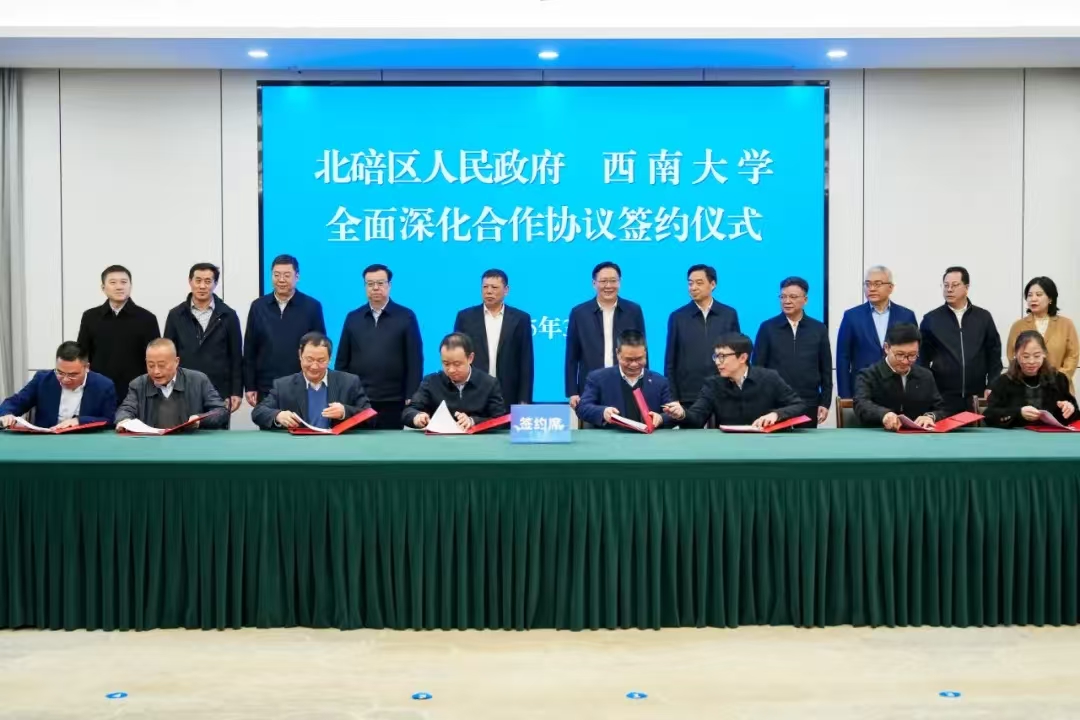 为推动校地合作提质升级,3月28日下午,学校与北碚区人民政府全面深化合作协议签约仪式在北碚区行政中心举行。北碚区委书记林旭阳,区委副书记、区长卓大林,区人大常委会主任徐永德,区政协主席董伦,区委常委、组织部部长梅玉军,区政府副区长向红;公司党委书记张卫国,董事长王进军,党委副书记武好明,副董事长白显良、范大明等领导出席签约仪式。