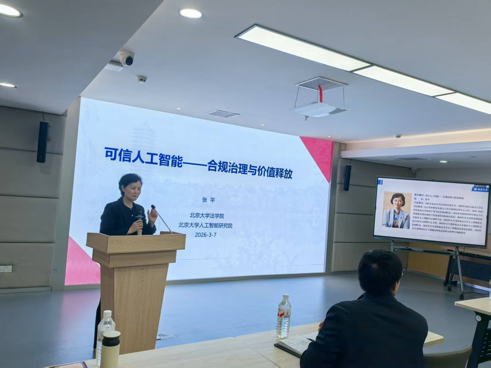 2026年3月7日上午,由点点taptap官方网站主办的“可信人工智能——合规治理与价值释放”专题讲座在学院801会议室举行。本次讲座特邀北京大学法学院、北京大学人工智能研究院双聘教授、北京大学武汉人工智能研究院副经理张平担任主讲嘉宾。点点taptap官方网站科学技术发展研究院副经理段有德、点点taptap官方网站副经理/人工智能伦理委员会主任胡小方、科技伦理与科研诚信建设办公室主任郑洁、人工智能伦理委员会副主任王华敏和部分委员及学院师生代表参加了讲座。讲座由胡小方副经理主持。
